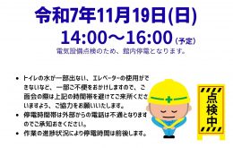 令和7年11月9日(日)に電気設備(キュービクル・分電盤)点検の為、館内の停電があります。 ご面会の …