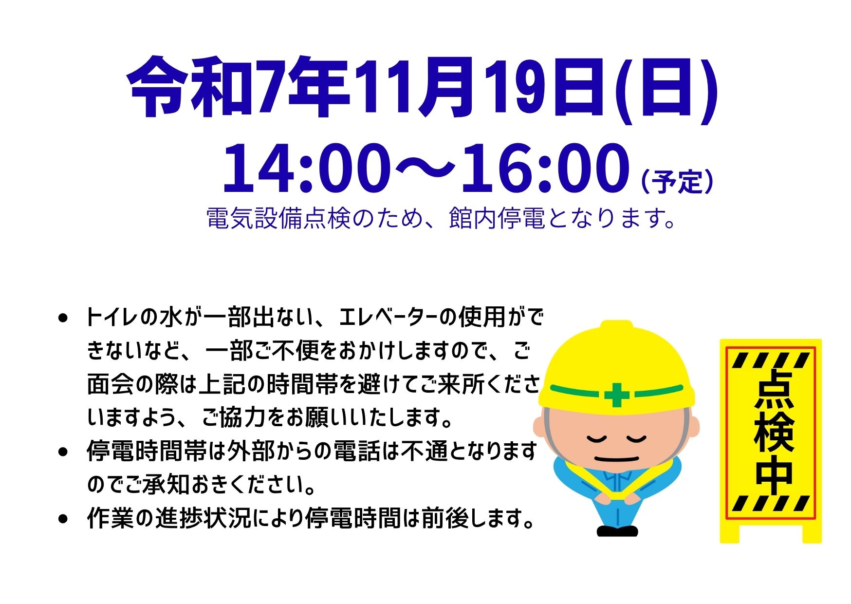 令和7年11月9日(日)に電気設備(キュービクル・分電盤)点検の為、館内の停電があります。