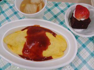 オムライス、野菜スープ、お楽しみデザート
