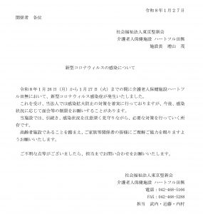 介護老人保健施設ハートフル田無において、新型コロナウィルス感染症が発生いたしました。