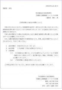 新型コロナウィルスの感染拡大によるご家族様の面会一時中止ついて