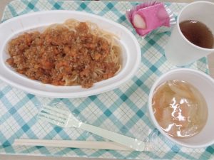 食事は「ミートソーススパゲティ、いちごミルクかん、コンソメスープ」